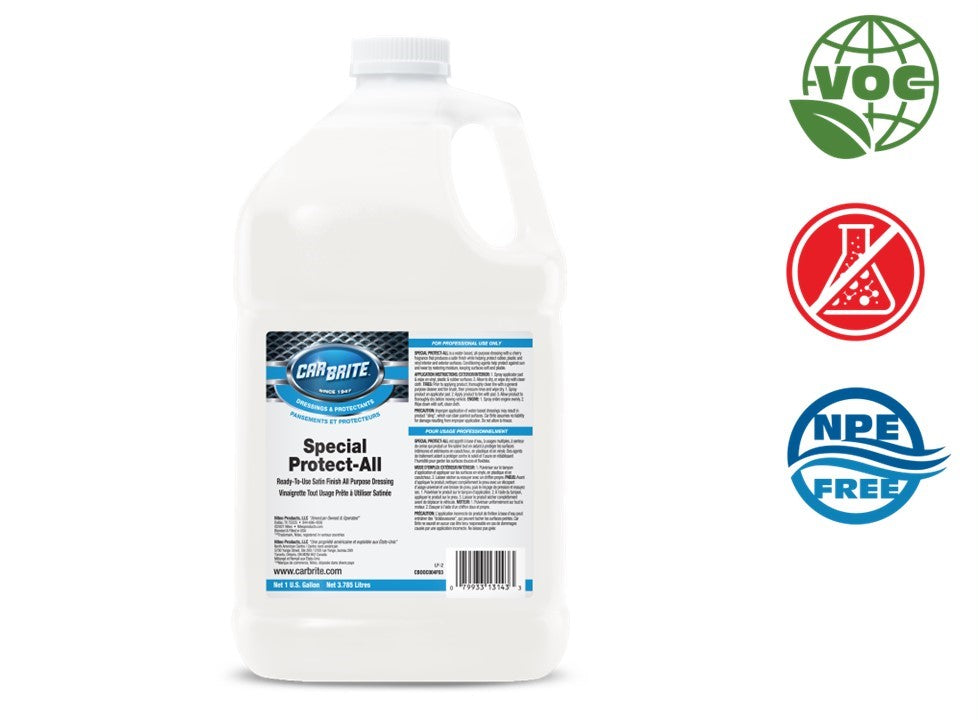 Thin, water-based dressing that builds a satin finish that provides lasting protection on rubber, plastic, and vinyl in both the cabin and on exterior trim. Its durable finish helps surfaces resist dust and light contamination, extending that freshly detailed look.