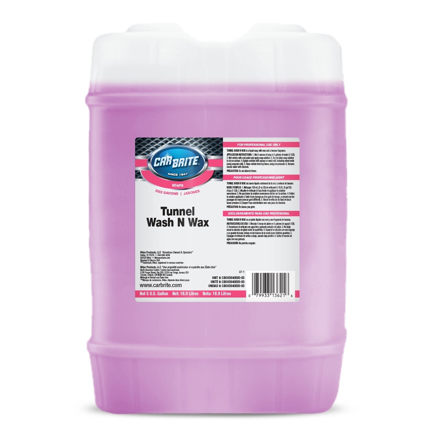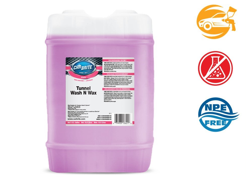 Banana-scented, pink wash & wax concentrate built for tunnel and high-volume washing, depositing a thin, durable wax layer that boosts gloss and promotes strong water sheeting. It helps cars exit the tunnel with added shine and protection, supporting higher perceived value with minimal added labor.